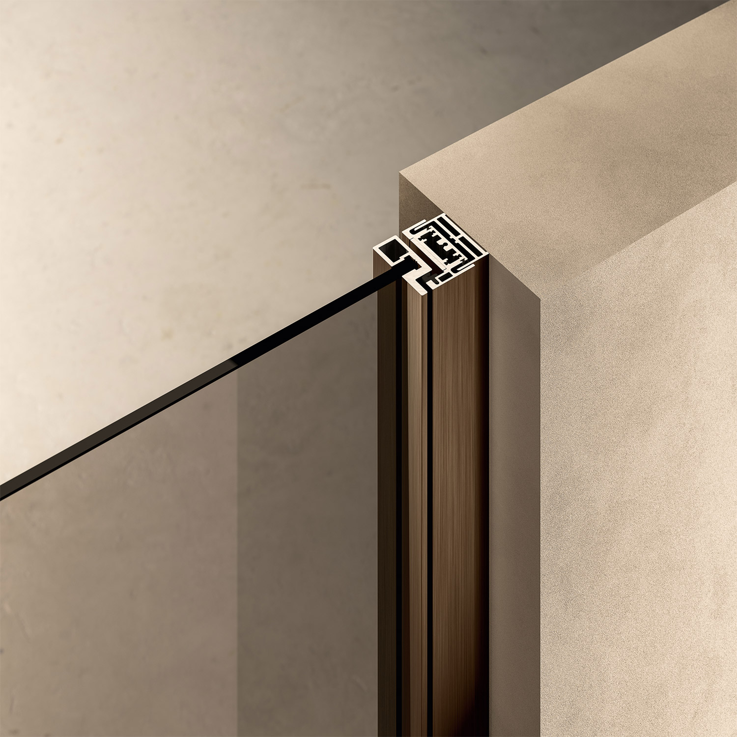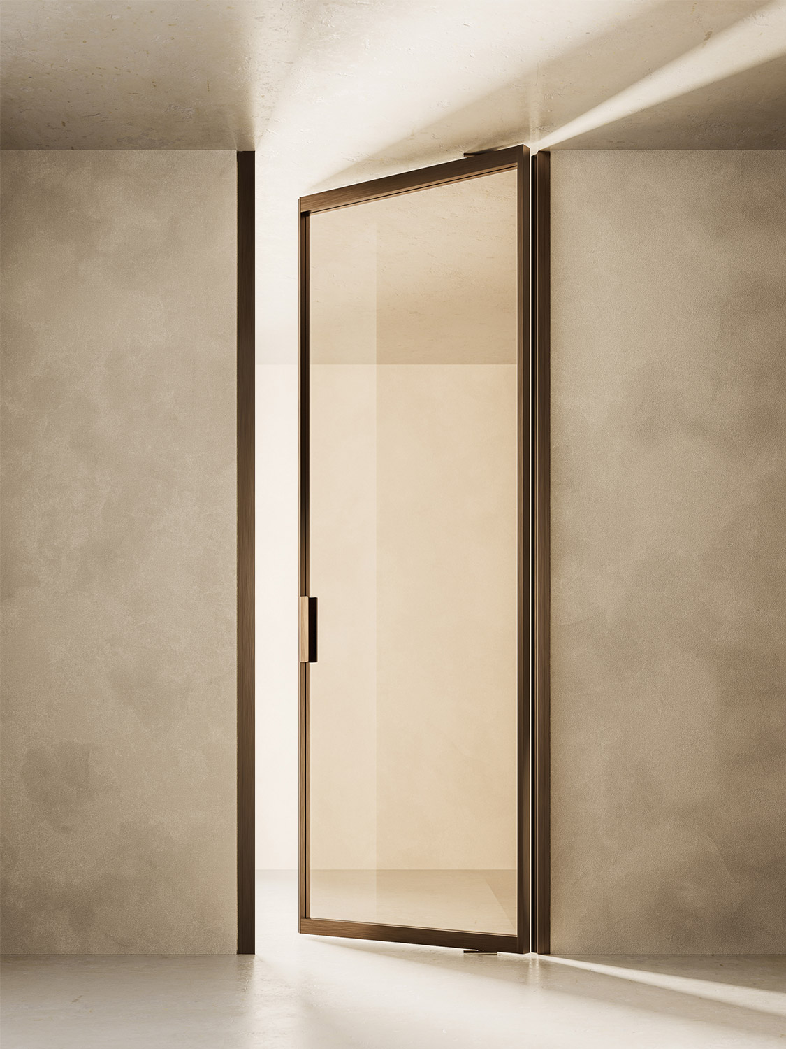 Pivot doors do not require frames or casings, in the case of specific technical requirements, can be combined with the Cube frame, which constrains their opening. This solution is mainly used when the pivot door is inserted within fixed wall designs. The door leaf profile must be shaped to fit against the frame.