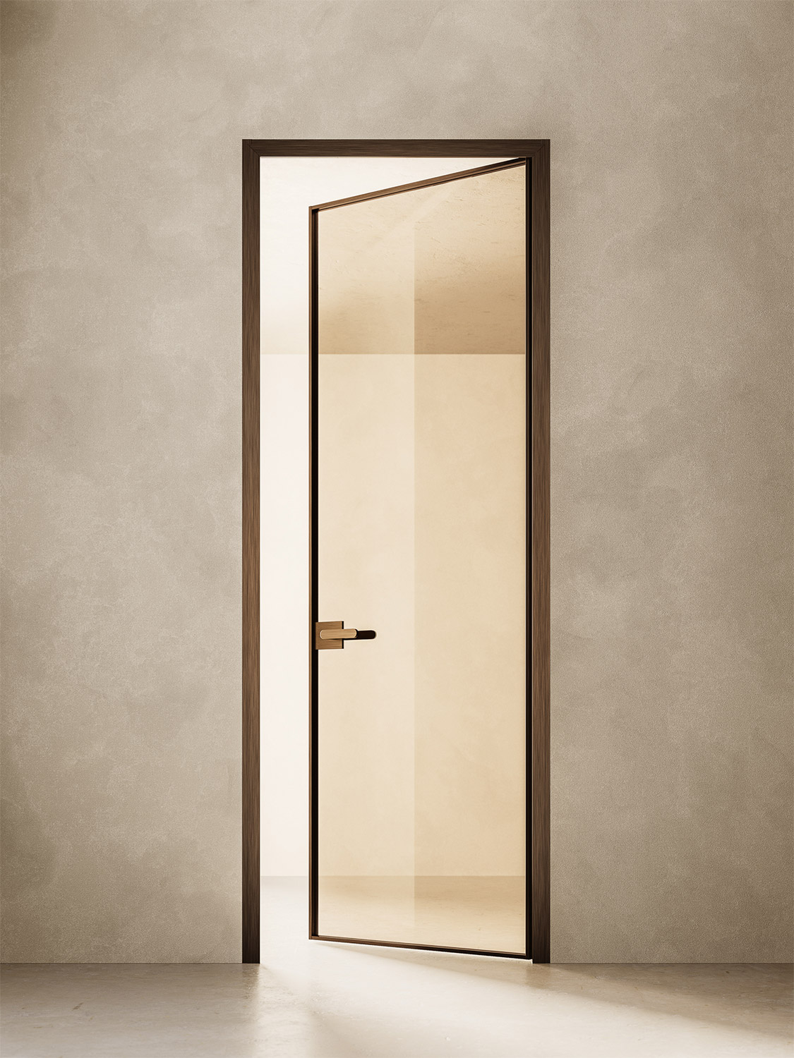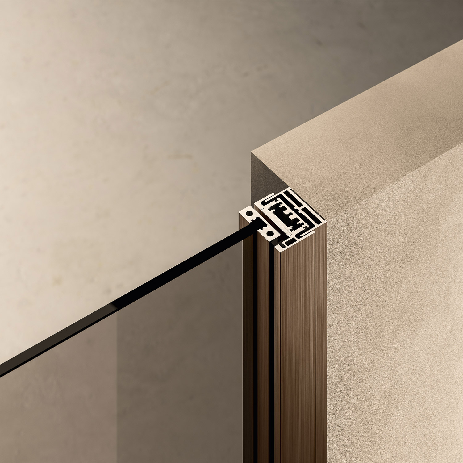 Versatile and easy to install. The proportions of the various elements that compose it and the lack of cover strips allow for the creation of refined designs. It can be installed flush with the wall or in another position with respect to the thickness of the wall. Also designed to be inserted into fixed wall compositions. In addition to the MH hinge shown here, the MH 180 hinge is also available.