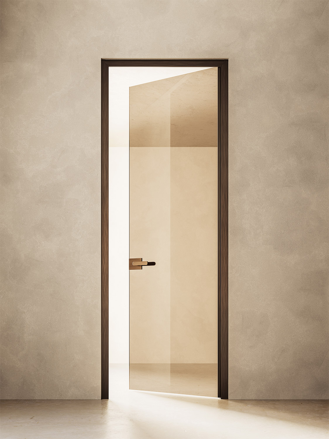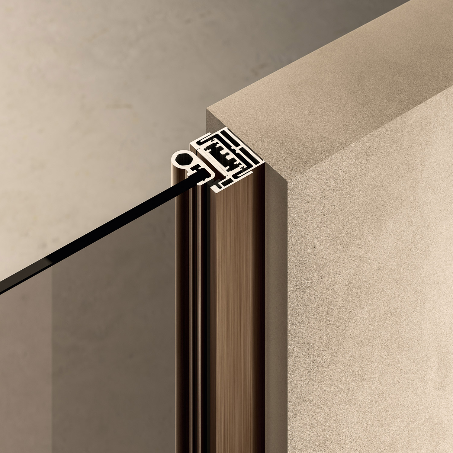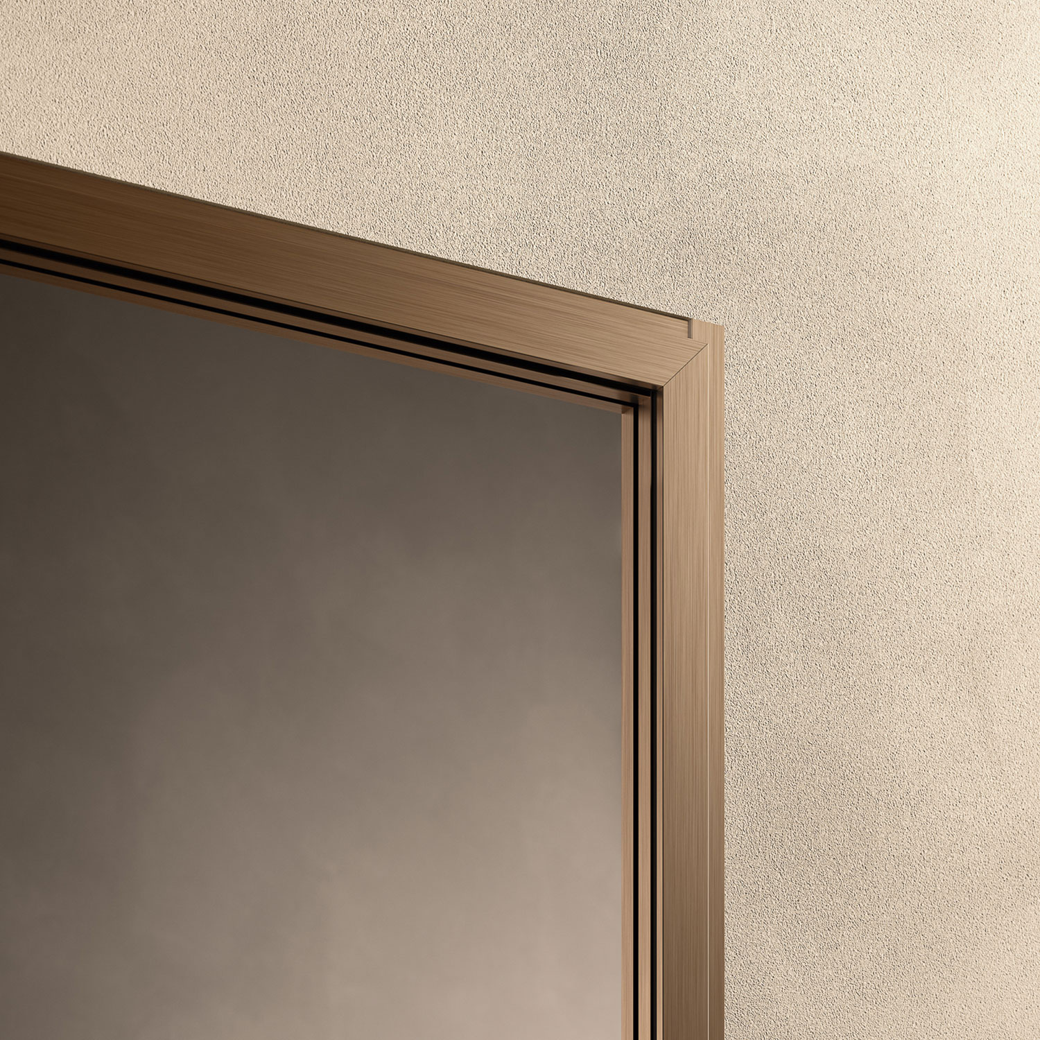 Versatile and easy to install. The proportions of the various elements that compose it and the lack of cover strips allow for the creation of refined designs. It can be installed flush with the wall or in another position with respect to the thickness of the wall. Also designed to be inserted into fixed wall compositions.