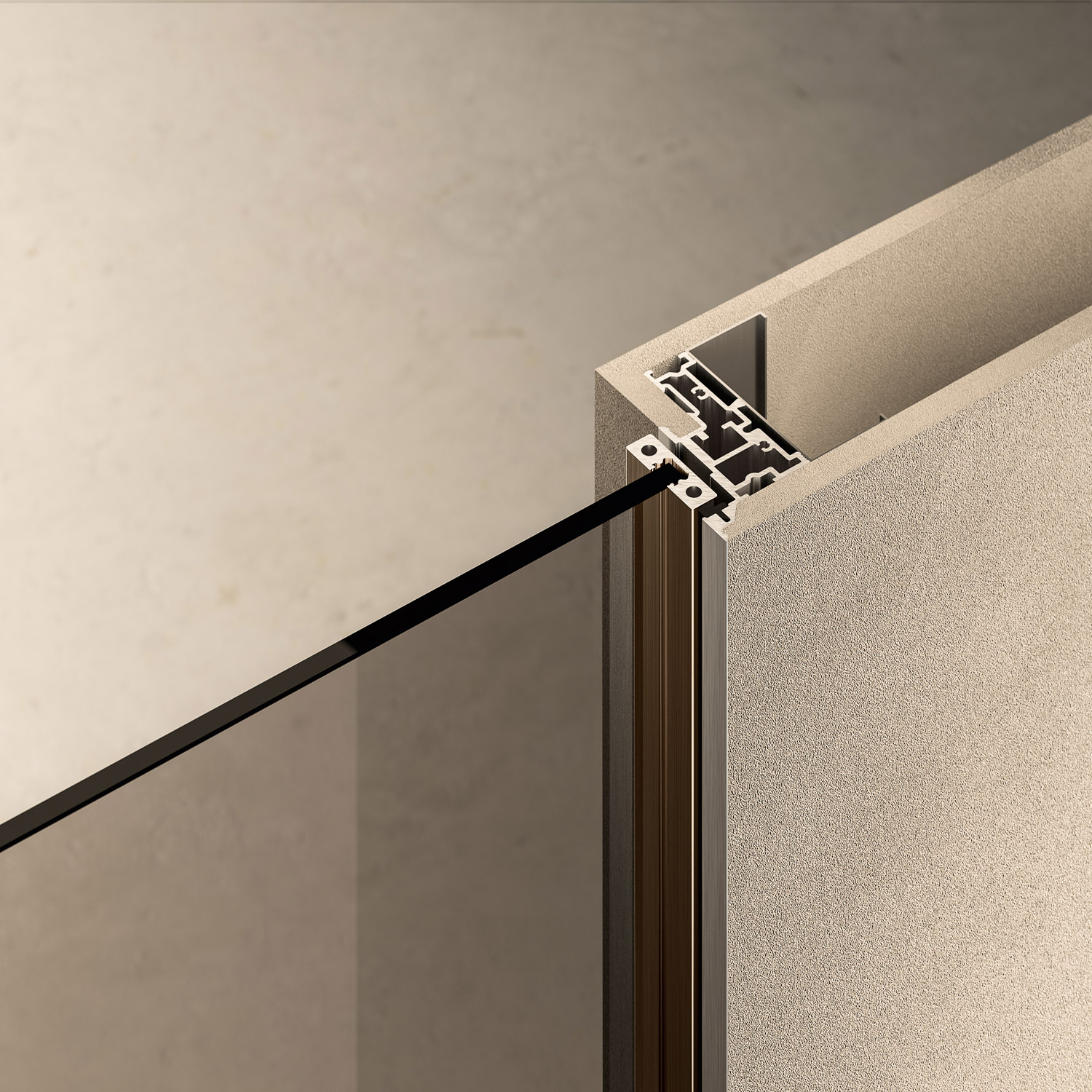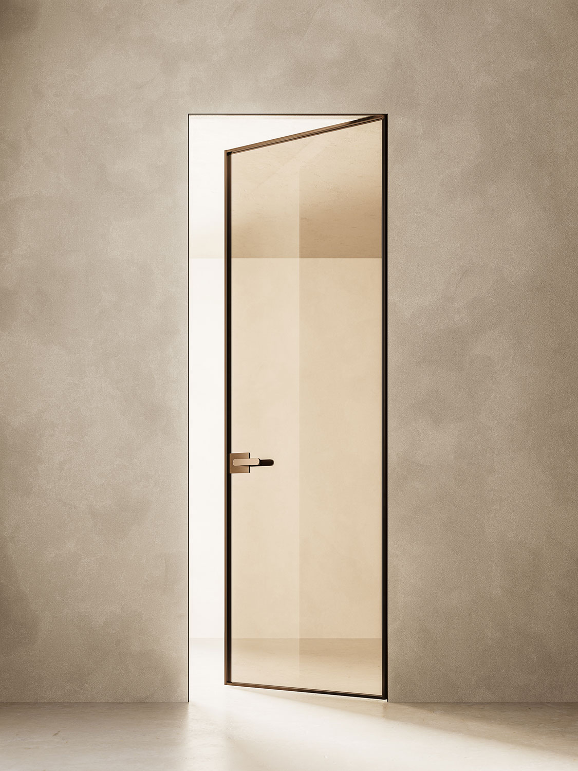 The Plain frame, hidden inside the masonry or the plasterboard, is optimal to enhance the design of the framed door. Thanks to the absence of aesthetic interferences, the door is expressed at its best. In addition to the MH hinge shown here, you can also choose the MH 180 hinge.