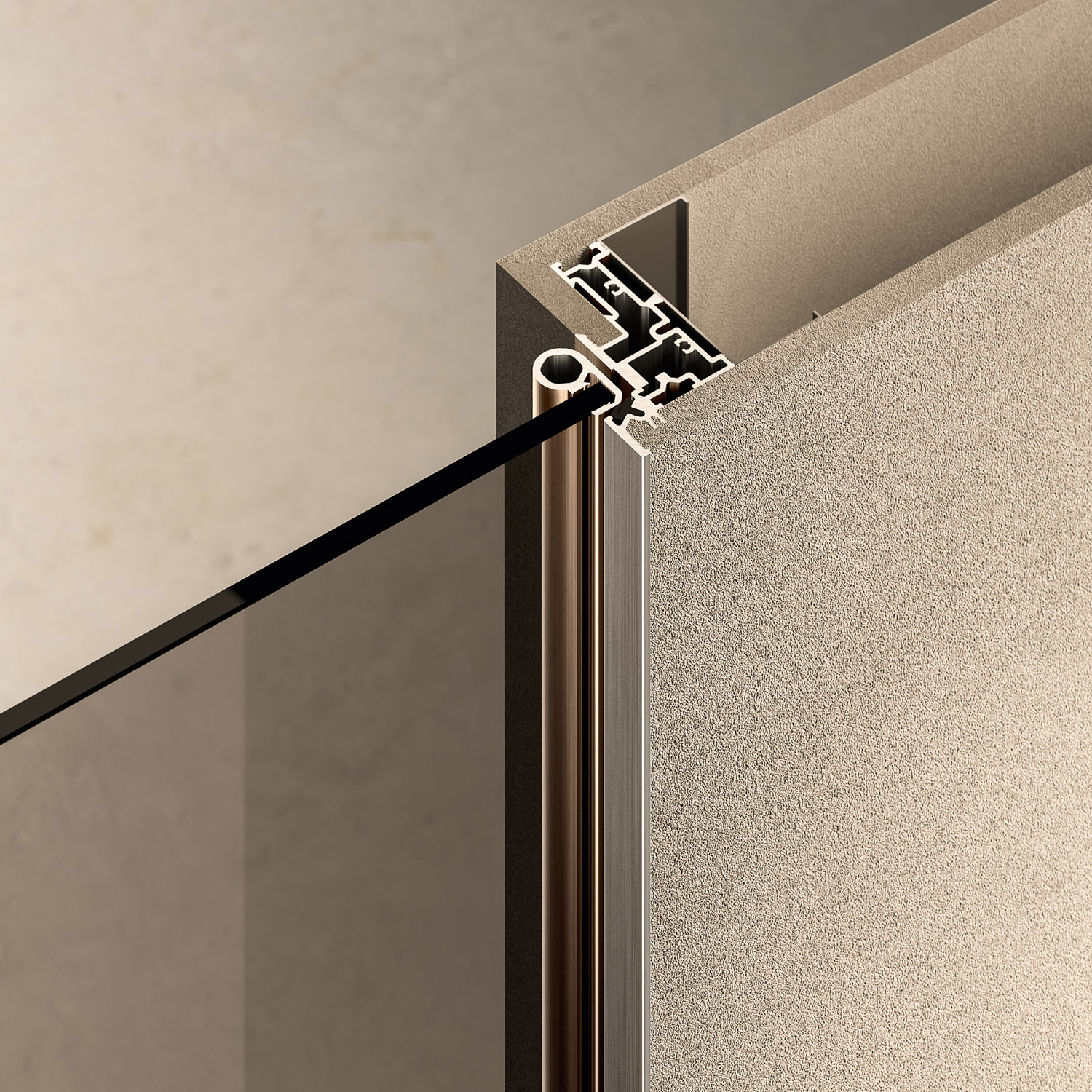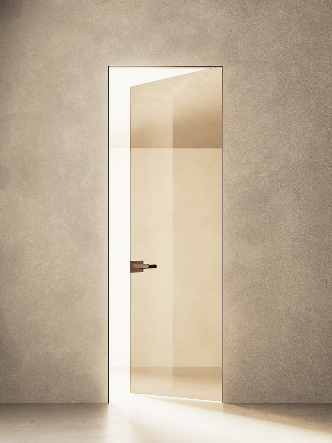 The Plain frame, hidden inside the masonry or plasterboard, is available in both pull and push versions. The total disappearance of the aluminum frame ensures an effect of continuity between the door and the wall and the assurance that, over time, no plaster cracks will form.