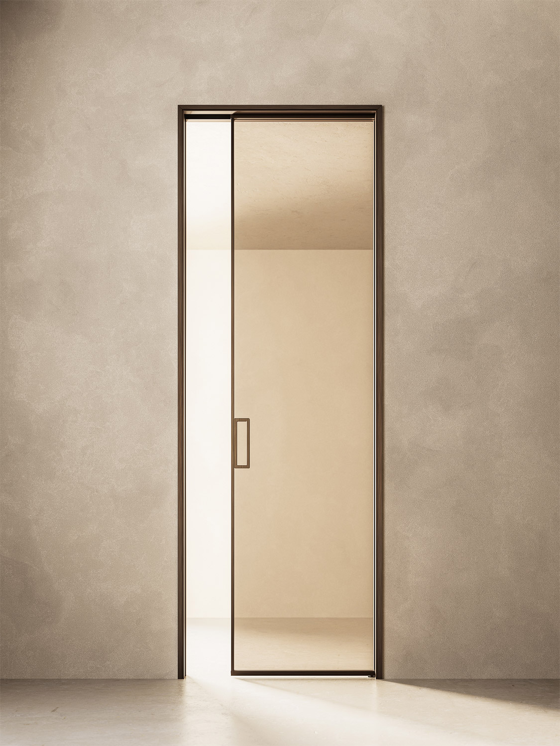 Technique and design come together in an ideal product for the framed glass door. The rough opening must be be prepared with a specific counterframe for doors without frame. The perimeter lighting (optional) becomes a precious frame able to enhance the environment.