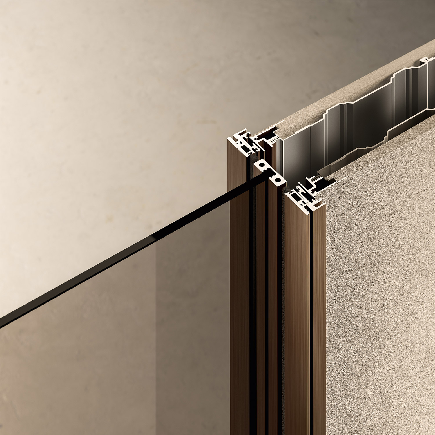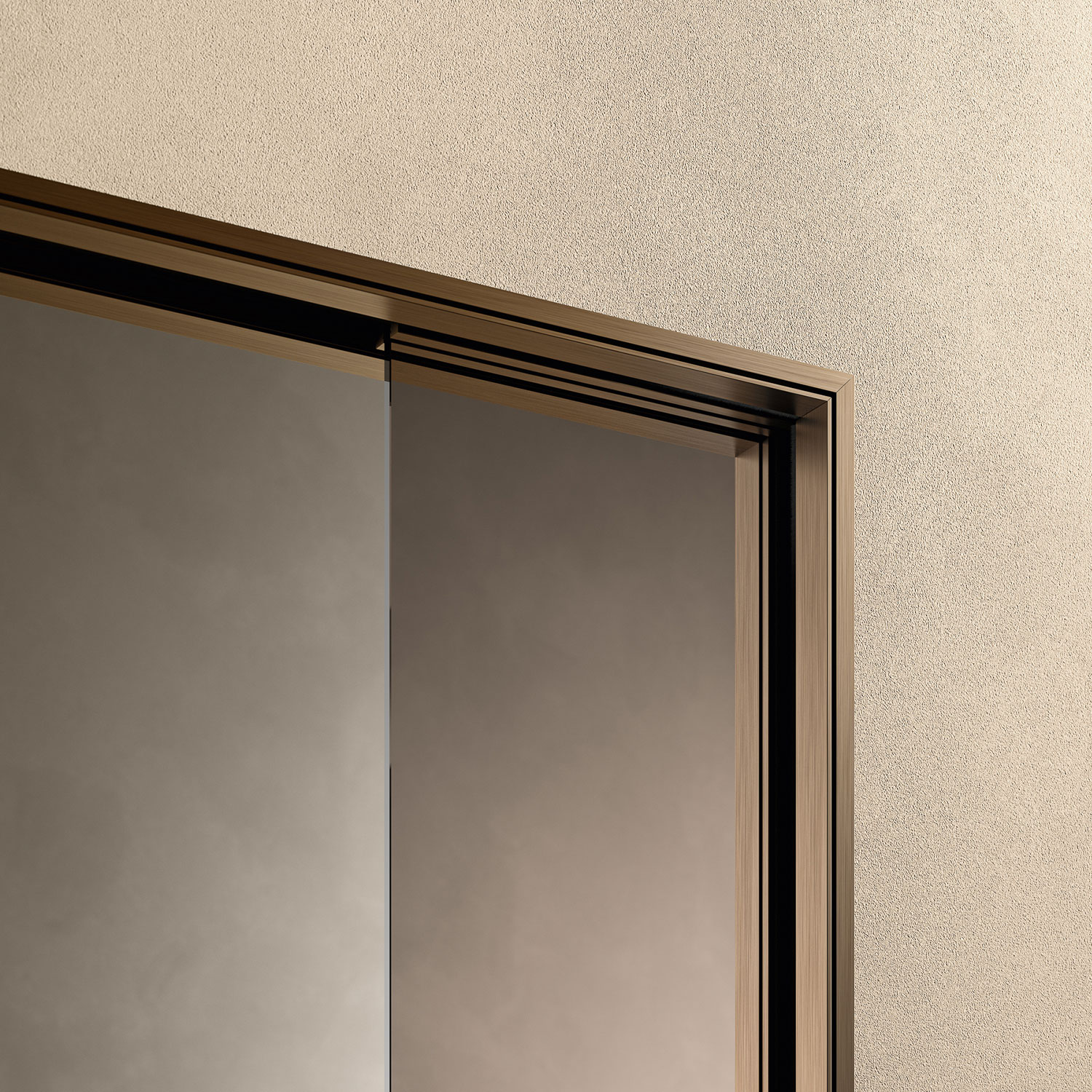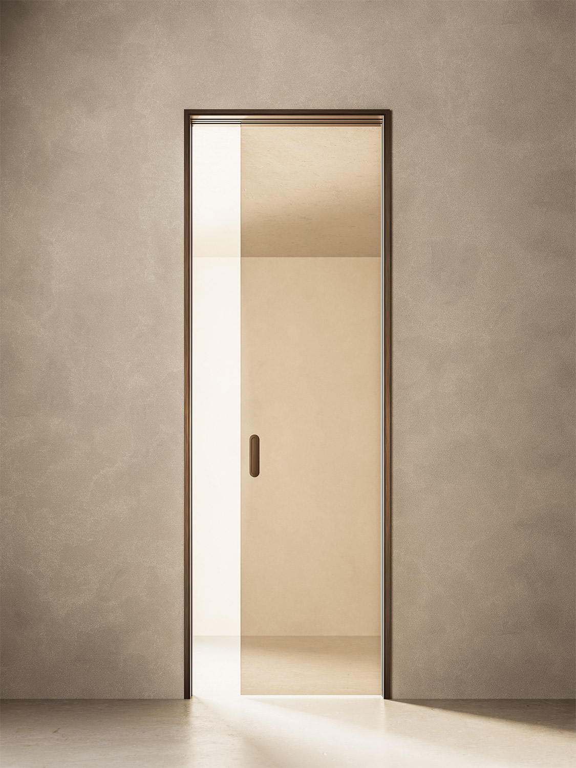This minimalist frame, with a slightly outward profile, leaves full power to light. In this way, the pocket door highlights the primary role of glass. The rough opening must be be prepared with a specific counterframe for doors without frame. The purity of the design can be further emphasized through led lighting.